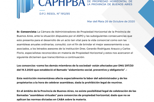 Tenemos el agrado de dirigir la presente con la finalidad de brindar una postura en relación a la posibilidad de convocatorias a asambleas en el marco de la pandemia y en el contexto de las normas legales vigentes a la fecha. El día viernes 04 de diciembre de 2020 se publicó en BO de la Prov.incia de Bs.As. el DECRETO PROVINCIAL Nº 1103/2020 que reglamenta el “Distanciamiento Social, Preventivo y Obligatorio” de conformidad con el Decreto Nacional Nº 956/2020. Mediante este Decreto…